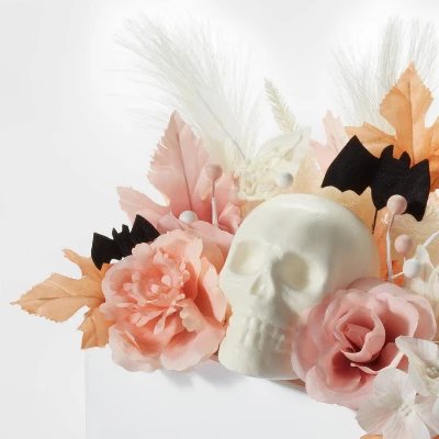 Add a beautiful centerpiece to your seasonal decor with the Bootiful Centerpiece with Faux Flowers Halloween Artificial Plant from Hyde & EEK! Boutique™. This artificial plant features faux flowers in pink and white hues along with a skull at the center to add a bit of spookiness. Set inside a white wooden container, this artificial plant is perfect to display on a tabletop, and blends well with your other Halloween decor.