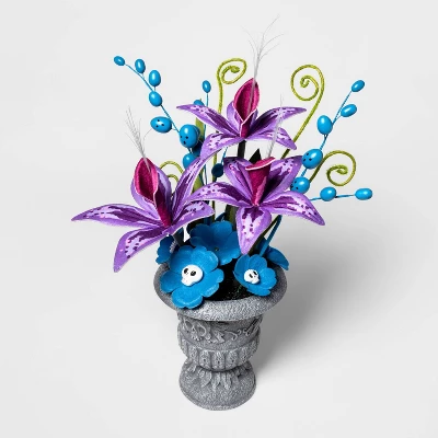 Bring a creatively creepy centerpiece to your Halloween table with the Ghoulish Garden Dungeon Lilies Halloween Artificial Plant from Hyde and EEK! Boutique™. This faux flower arrangement features a dramatic design bursting with blue, purple and pink lily-like flowers as well as green faux foliage. Small skeleton faces decorate the blue flowers near the base, and the entire arrangement sits in a faux stone planter decked out with sculptural skull and ghost details.