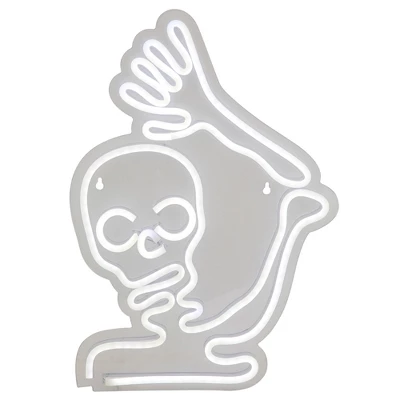 Freshen up your holiday decor with this modern, neon style skeleton silhouette. Vibrant bulbs add light and color. The perfect statement piece for walls or windows. Easy installation makes Halloween decorating a breeze.Features:Color: white tubes One-sided designBulbs stay cool to the touchLED lights use 90% less energy6ft lead cordProduct Features:Super bright and vibrant tubesUL certified and approved for indoor use onlyCannot be connected together with other lighted itemsComes ready-to-hang from 2 keyholes on each side2 peel and stick hooks includedClass 2 power supplyPowered by USB – power plug includedInput: 100-240 volts, 50/60 hertz, .35 ampsOutput: 5 volts, 1 ampsDimensions: 15.25″H x 11″W x .75″DMaterial(s): PVC/wire/metal